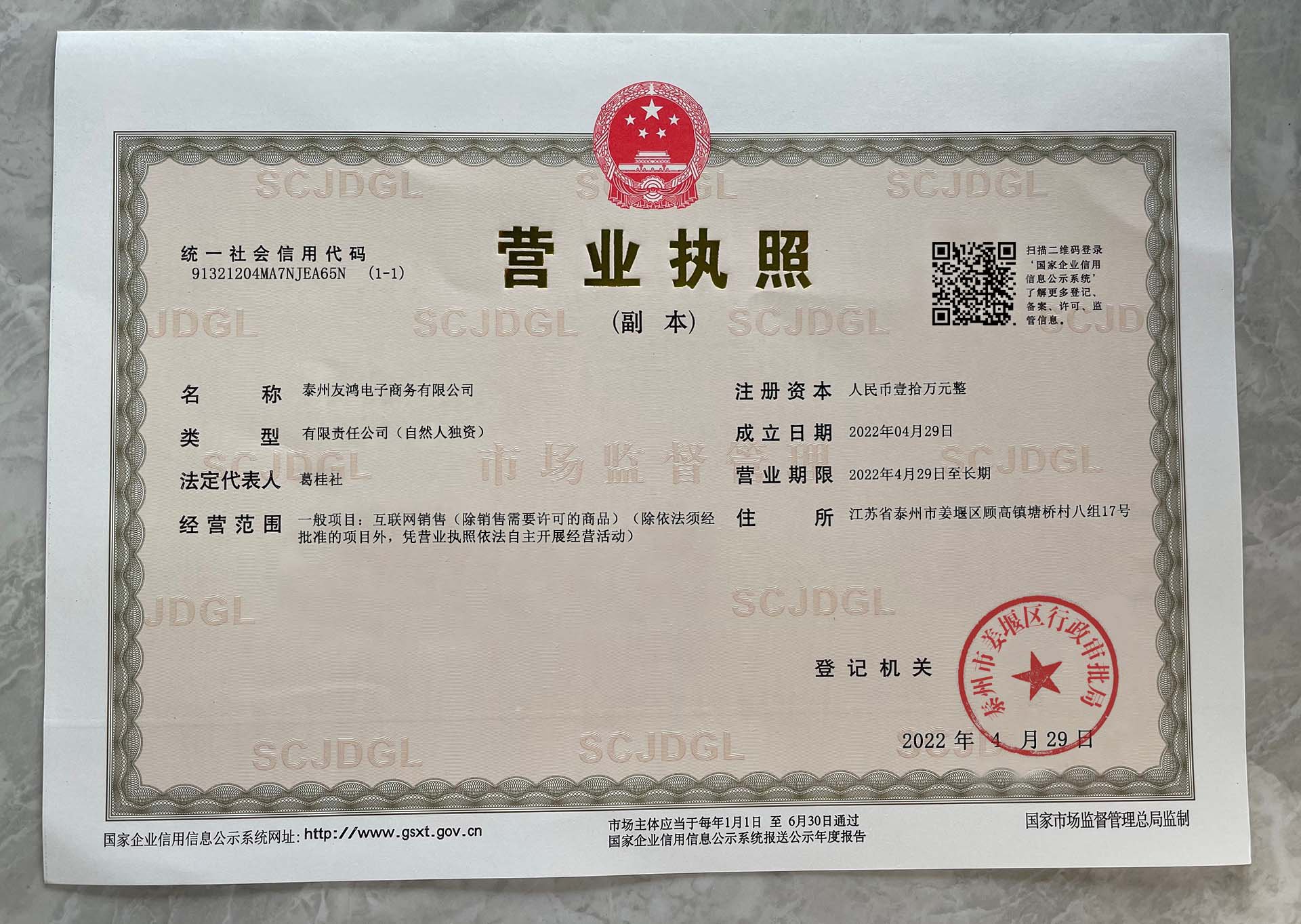 Corporate name:Taizhou Youhong E-commerce Co., Ltd